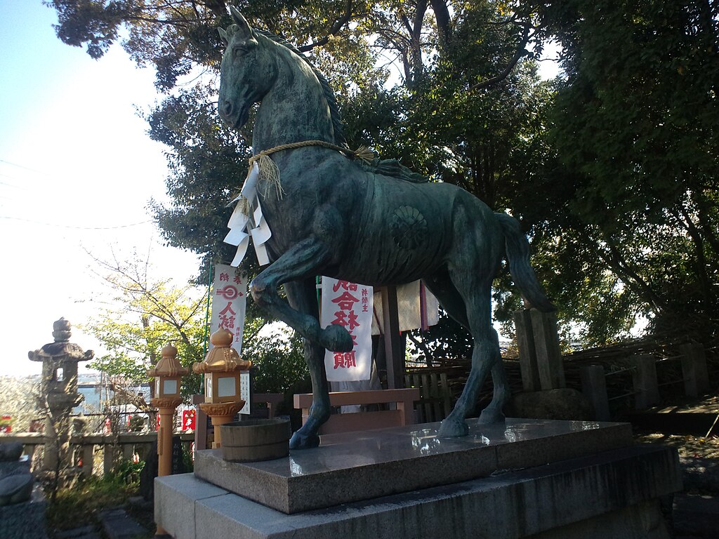 Shinme, statue de cheval en bronze au sanctuaire Kamisaki-jinja à Handa (Aichi) – Photo de Yanajin33 (Wikimedia Commons)